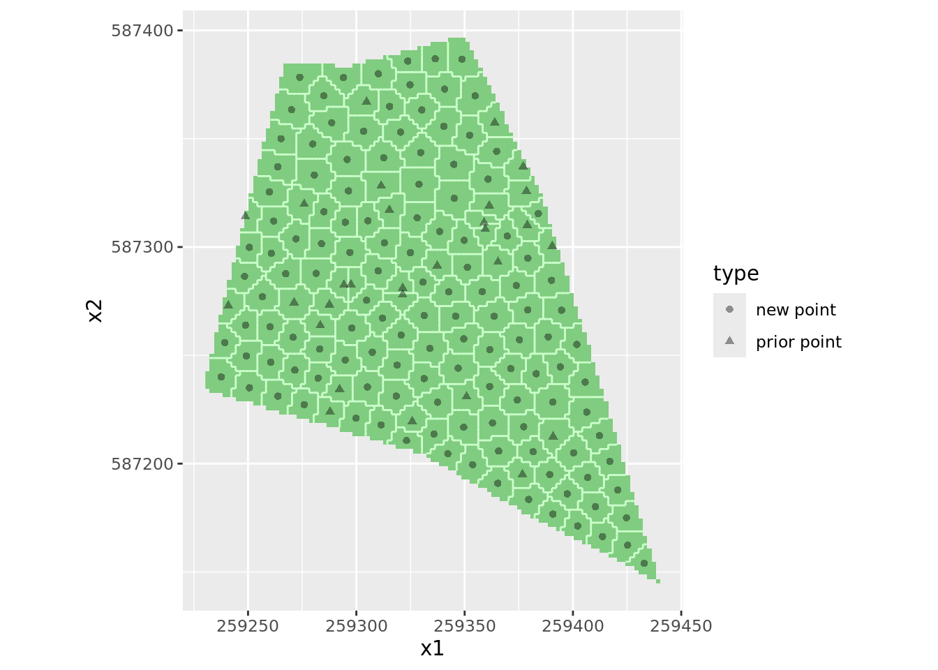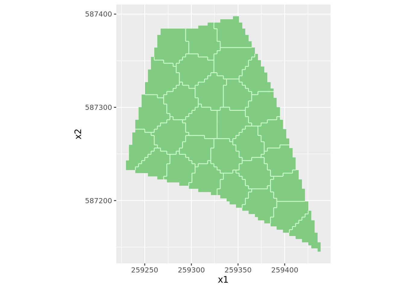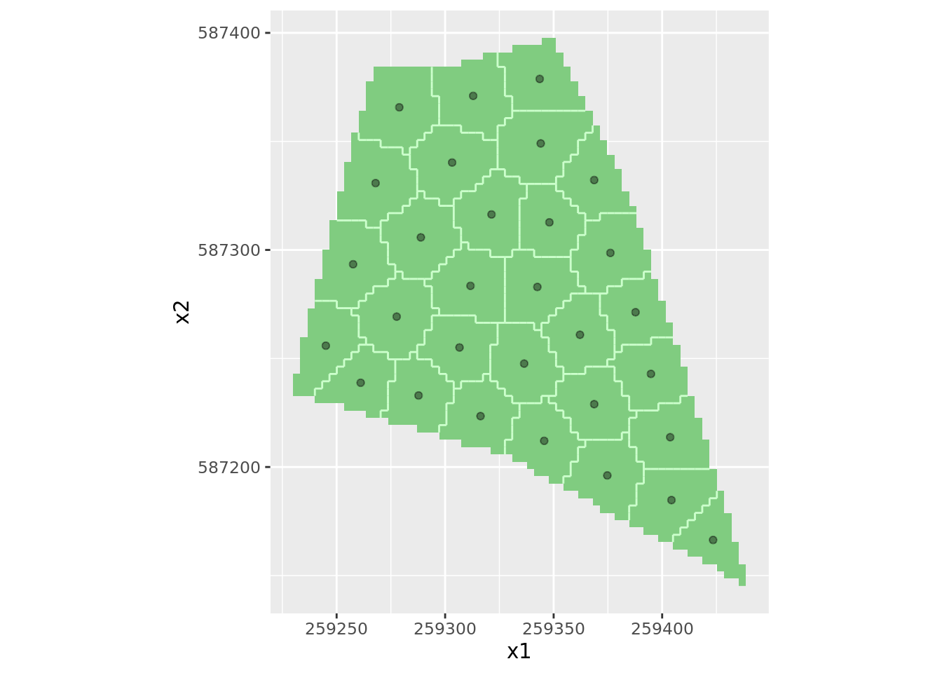 coords = c("x1" , "x2"))Voici la représentation du plan d’échantillonnage pour la géostatistique.