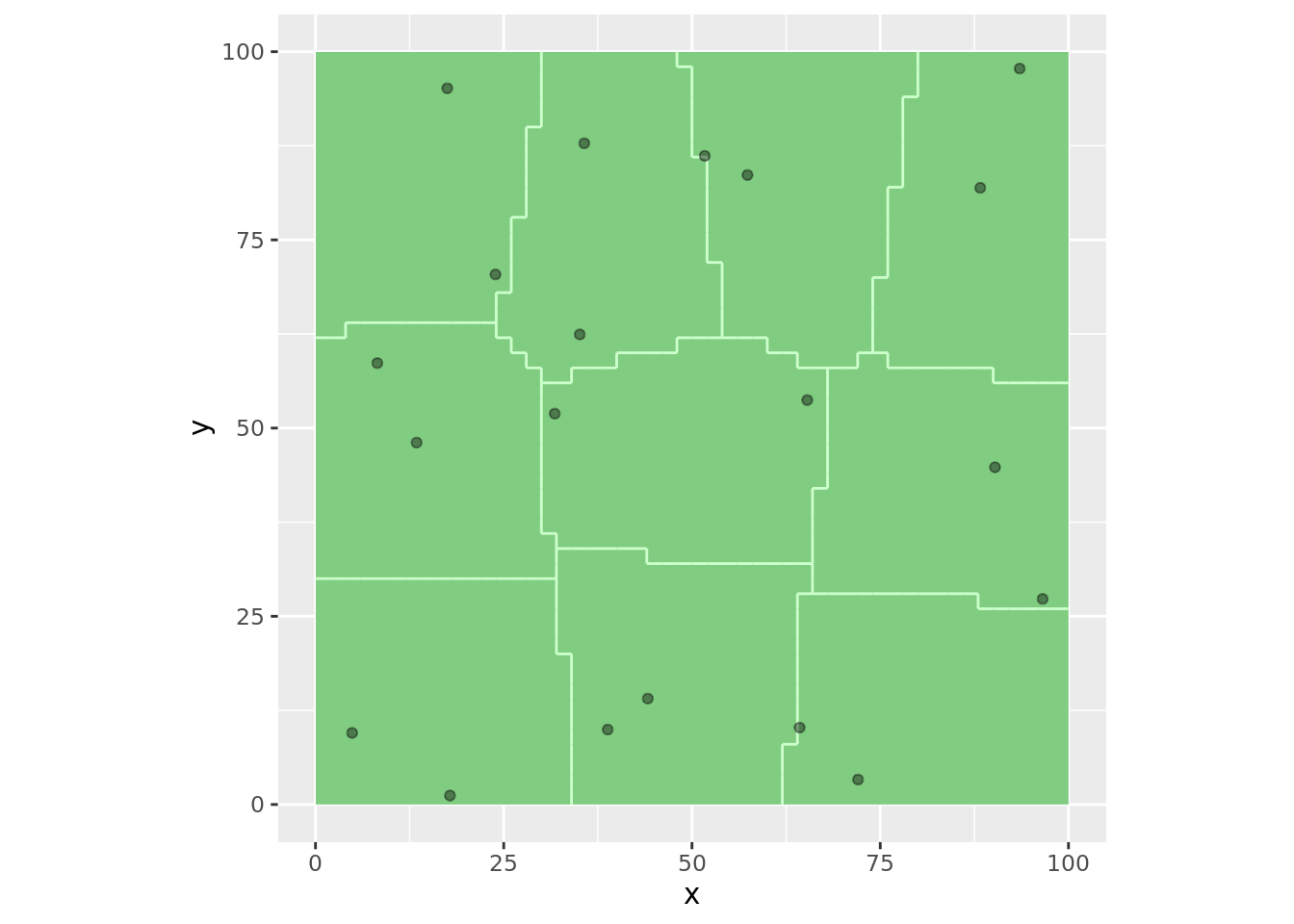 Dans cette appraoche, il n’est pas nécessaire de définir un variogramme a priori pour l’optimisation de la répartition des \(n\) observations. Les strates ainsi définies sont appelées Strates compactes